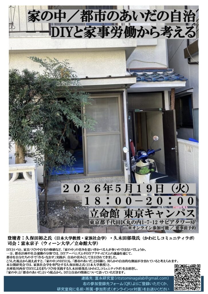 この度、科研費基盤研究B・国際共同研究加速・鹿島学術振興財団ほかによる富永研究室の研究プロジェクト「空き家を利活用した都市空間の自治――スクウォット・DIY研究の文脈から」の一環として、「都市」と「家庭」におけるDIYと自治の関係をテーマに研究会を開催いたします。